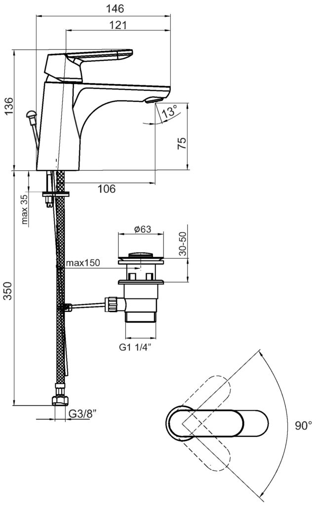 Einhebelmischereinsatz mit Keramikscheiben, kompakte Ausführung, fester Gussauslauf, Perladüse, Mengenbegrenzer, Temperaturbegrenzer, Zugstangen- Ab- und Überlaufgarnitur, Anschlussschläuche 3/8