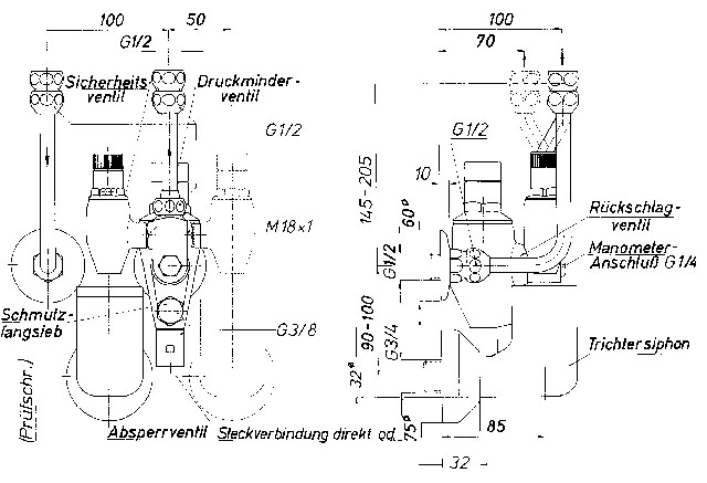 mit Druckminderventil 1/2, Speicheranschluß 1/2, Trichter-Geruchsverschluß 3/4, Schmutzfangsieb, Sicherheitsventil eingestellt auf 6 bar Öffnungsdruck, Druckminderventil eingestellt auf 4 bar Hinterdruck