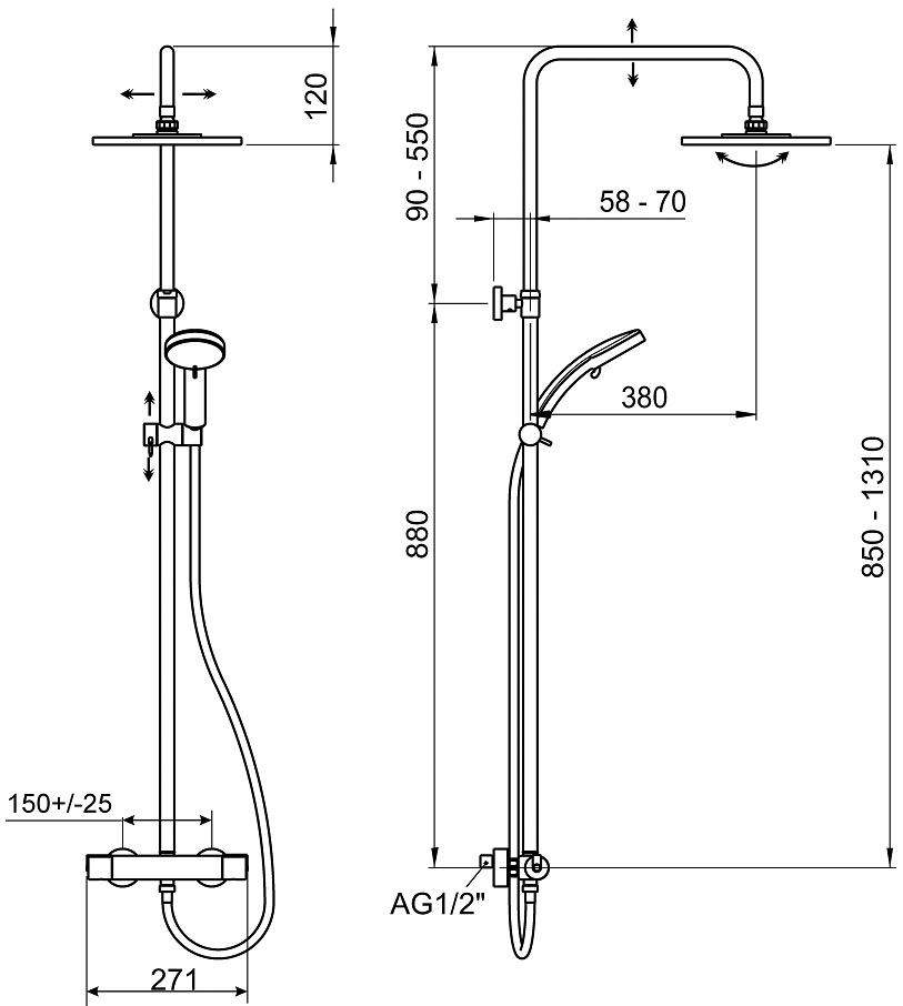 Das TOP Wandbrause und Regenbrause System mit schwenkbarem Teleskop Standrohr. Die Regenbrause Kopf mit einem Durchmesser von 250 mm, höhenverstellbarem Handbrausehalter und 3-Funktionshandbrause, Metallbrauseschlauch 150 cm, Wand-Brausethermostat, Thermostateinsatz mit Dehnstoffelement, mit integriertem, keramischem Mengenregulier- und Umstellventil für Kopfbrause/Handbrause, Sicherheitssperre bei 38°C Durchflußmenge bei 38°C und 3 bar Fließdruck: Stellung Brause: 26,0 l/min. Einzelteile: Thermostateinsatz GS 34991