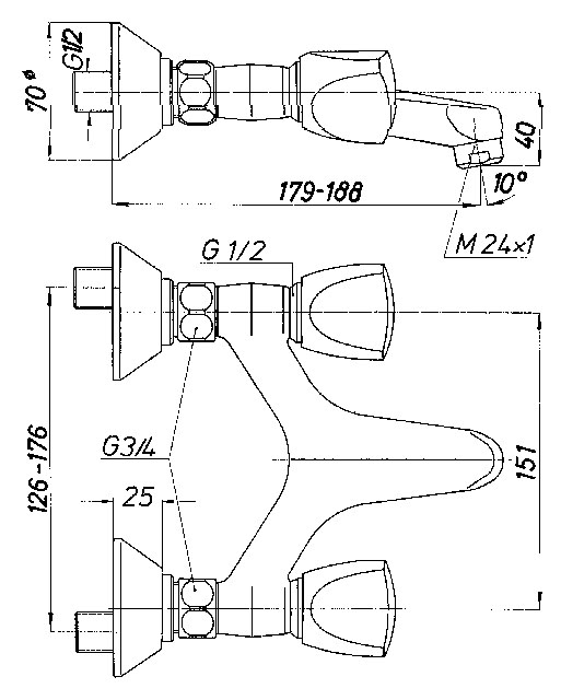 Zweigriffarmatur für Badezimmer und Küche, mit Wandmontage, fester Gußauslauf, Perladüse, (Durchflussklasse Z), Exzenteranschlüsse 1/2