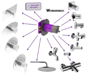 Die von uns im eigenen Unternehmen entwickelte Wunderbox deckt nun ALLE nötigen Einbausituationen ab. Man braucht nur noch eine einzige Einbaubox, und kann später absolut alles darin einbauen. Egal ob Thermostate, Einhebelmischer, Unterputzventile, Anschlüsse, Eckventile, Wasserzähler oder was eben sonst noch nötig ist. Zudem ist die Wunderbox auf alle Installationsmöglichkeiten bestens vorbereitet. Egal ob im Trockenbau, Mauerwerk, hinter oder vor der Wand, sie deckt wirklich alles ab, bietet zudem höchste Stabilität, Dichtheit und Geräuschentkopplung. Zur Produktübersicht und zu den Prospekten.